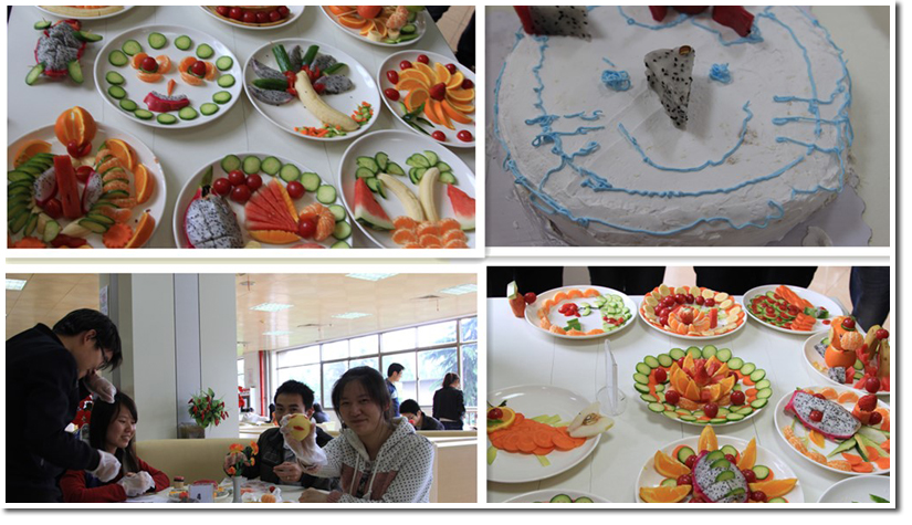 “蛋糕DIY”和“水果拼盘”是同学们创意美食的乐园,同学们自由组队,利用蛋糕、奶油、水果等原材料,制作出各种精美的蛋糕和精致的水果拼盘,团队合作迸发出创新的火花,一个个充满新意的作品展示了科大学子的创新精神和动手能力。