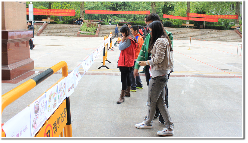 “美食心声”是一场关于同学们最想在食堂吃到的菜的调研,通过线上线下的问卷调查,统计得出同学们最想吃到而食堂没有的菜,调研结果将直接反馈给饮食服务集团,以便于食堂根据调研结果来调整食堂菜单,更好的服务于同学的需求。“知食长廊”是一个宣传健康养生小贴士、中华美食文化、中华菜系等知识的长廊,通过图片展的方式,在美食广场上向同学们展示了相关健康和饮食的常识以及中华各大菜系的介绍,引起了广大同学围观,起到了很好的效果。此外,在4月13日,校学生美食社也在美食广场上举办了关于饮食和健康的各种好玩的小游戏,寓教于乐,向同学们宣传了“健康饮食”的文化。