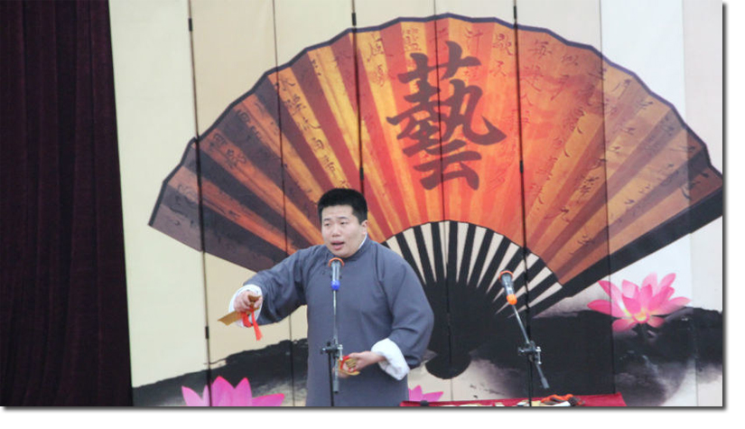 本次演出特邀了前校学生社团管指委文艺类分管委员王子松担任嘉宾主持。晚上7点钟,水上报告厅已经挤满了前来观看演出的观众。第一段节目是由黄灿表演的快板《诸葛亮押宝》。他的演唱节奏鲜明,气势流畅,引来了观众们的阵阵掌声。