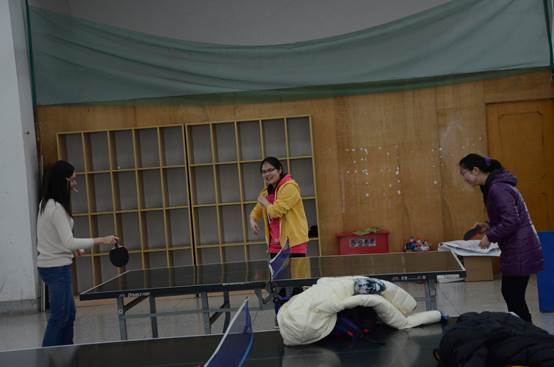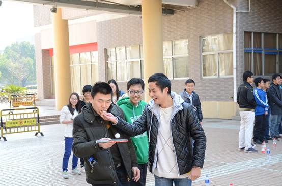 相对于专业组比赛的紧张激烈,趣味组的比赛诙谐的多。大家通过报数的方法随机分为4个人一组,开始颠球接力比赛。每组的同学们都必须用球拍颠球绕行过用矿泉水瓶摆放的障碍,同时负责每个字母的同学都有特殊的任务:U组同学必须蹲下提起放在地上的两个大水瓶然后走到终点接力给S组同学,S组同学在颠球过障碍时必须回答由裁判提出的几道简单的数学问题然后接力给T组同学,T组同学需要在行走前记住计时员告诉他的一句话传话给C组同学,而C组同学不单单要回答话的内容,还要在行走时吃掉T组同学喂给他的早餐包。大家都发挥的不错,尽力地完成任务。通过趣味比赛明白了协作的意义,增强了同学之间的交流。