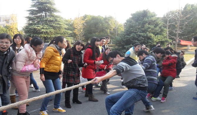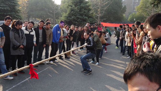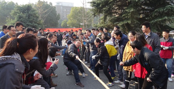 为保证本次比赛的公平性,比赛顺序抽签的方式确定,比赛场地用掷硬币的方式进行选择,比赛方法采用单败淘汰规则,三局两胜决出胜负。上午九点,比赛正式拉开大幕,17支队伍进行了激烈异常的角逐。拔河的双方选手都紧紧握着拔河绳,双脚紧紧地踏着地,身体向后压着;参赛队伍的导师在旁边出谋划策,拉拉队的同学也在旁边拼命地喊着口号,为比赛的队伍加油。比赛现场,欢呼声、呐喊声、口号声,层迭不穷。经过上午激烈的角逐,产生了前四强队伍,他们分别是施蕴渝教授实验室、胡兵教授实验室、魏海明教授实验室以及刘海燕教授实验室。