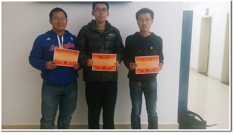 最终,在活动截止前分别有三位同学到达了第四关,并且有两位已经完成了第四题的解答,根据完成时间顺序,排名如下:第一名贾远航同学(中),第二名邱启迪同学(左),第三名谷尚育同学(右)。组委会对获奖选手现场颁发了奖状。
