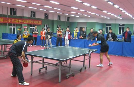 12月15日晚,东区乒乓球馆上演了一场既经典而又别开生面的比赛——师生乒乓球对抗赛。本次赛事由校体育部主办,校乒乓球俱乐部承办,校教工乒协和学生乒协协办,共有教师和学生队伍各八支(男队六支,女队两支),每支队伍由三人组成。赛制为五局三胜制,均为单打比赛。