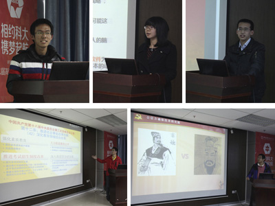竞赛中,同学们选举的角度各不相同,用精心制作的PPT跟在场师生分享自己对十八届三中全会的认识和理解。王宁宁畅想十八届三中全会改革完成后我们生活将面临的变化,让大家感受改革将带来切实的变化。张禄禄通过和十一届三中全会比较,让大家感受到本次会议的重要意义,以及新的形势下我们国家所面临的困难和挑战。周囡清跟大家分享了自己在开放单独二胎和制定渐进式延迟退休年龄政策方面的看法,认为这些政策上的创新是符合社会发展需求的,是对缓和老龄化社会问题的有力解决办法。吴昊楠关注社会事业方面的改革,他认为减少统考科目,不分文理科等政策,对青少年扩展知识面,加强体育锻炼,注重美育,关注青少年身心健康都是极有帮助的。李迎新通过学习十八届三中全会的三个文件,总结出为了解决人民群众当前遇到的困难,为了提高人民群众对执政党的信心,中国共产党正在下大力气改革,并且下定决心要在改革中取得成效。张英男分析了历史上几次著名的变法运动,以史为鉴,分析改革成功的关键要素,提出改革要想成功,必须提高公信力、执行力和透明度。姚超根据目前大学生就业困难的现状,分析了健全促进就业、创业体制机制改革政策。董雪和大家一起分享了关于财税改革相关方面的改革政策。