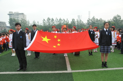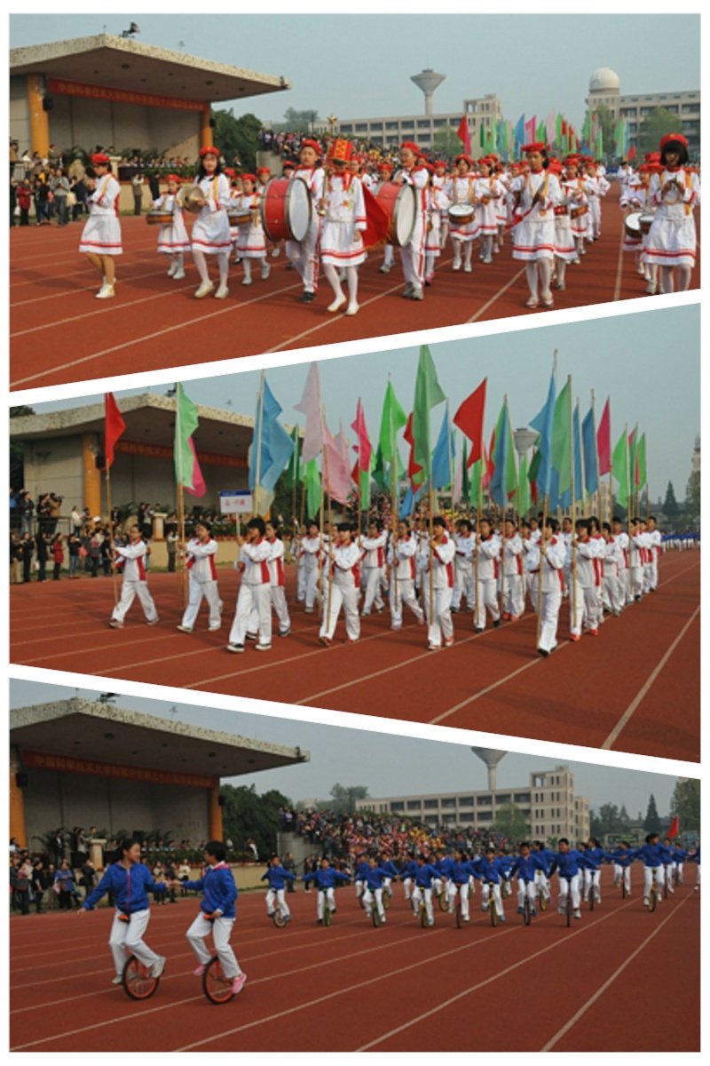 附中副校长蔡婉若宣布运动会开幕式开始。伴随着鼓号声,国旗、校旗和本届田径运动会会旗率先经过主席台前。在由高一(1)班全体学生组成的彩旗队的引领下,首先独轮车方队入场,接着各学部同学衣着整齐、精神饱满地经过主席台前。许多班级打着精心设计的横幅,手持花环、彩球,高喊口号,展示了班级蓬勃向上的精神面貌。