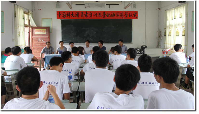 校团委副书记张平、金寨油坊店乡中心学校校长吴永安、六安团市委书记郭兴龙共同签署了《中国科学技术大学团员素质基地》续约协议。