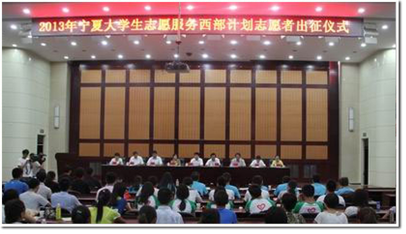 7月29日,宁夏2013年大学生志愿服务西部计划志愿者出征仪式在宁夏自治区党校礼堂举行。宁夏自治区团委书记马金元等领导出席仪式,并为宁夏2013年大学生志愿服务西部计划志愿服务队授旗,同时为2012-2013年度在西部计划、研究生支教团等志愿服务中涌现出的先进集体和先进个人颁奖。我校研究生支教团第十四届支教队队员郑伟、洪佳楠、魏琪和李醒民荣获“2012-2013年度宁夏大学生志愿服务西部计划优秀志愿者”荣誉称号。