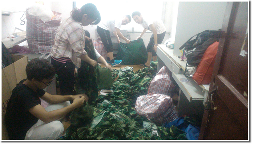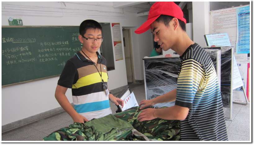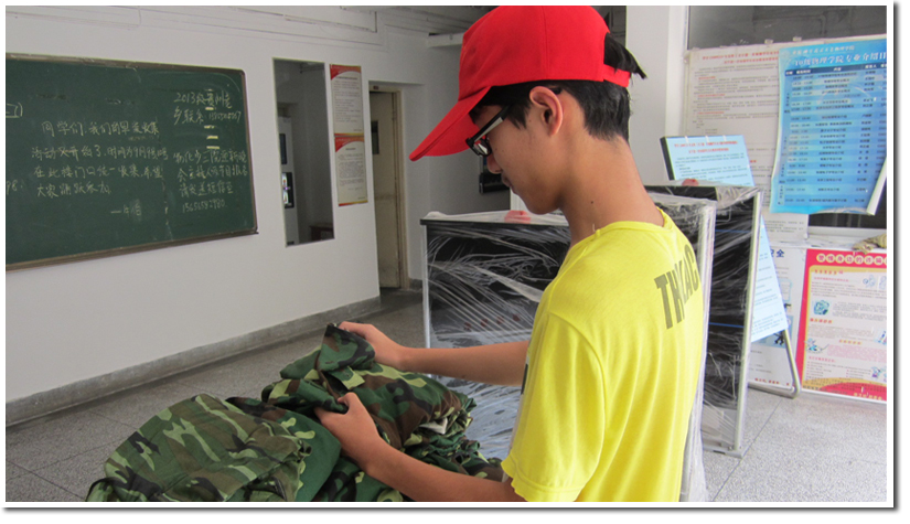 捐赠活动主要集中在9月9日和10日,在东西区同步展开。通过前期的海报宣传、电子屏宣传,同学们已经知道了军装收集的具体时间和地点,志愿者在各宿舍楼下负责收集和整理。同学们的热情很高,前来捐献军装的同学络绎不绝,志愿者们准备好的袋子很快被装满。为避免遗漏,我们请捐献的同学告知周围寝室,增加宣传力度,为需要的人募集到更多军装。