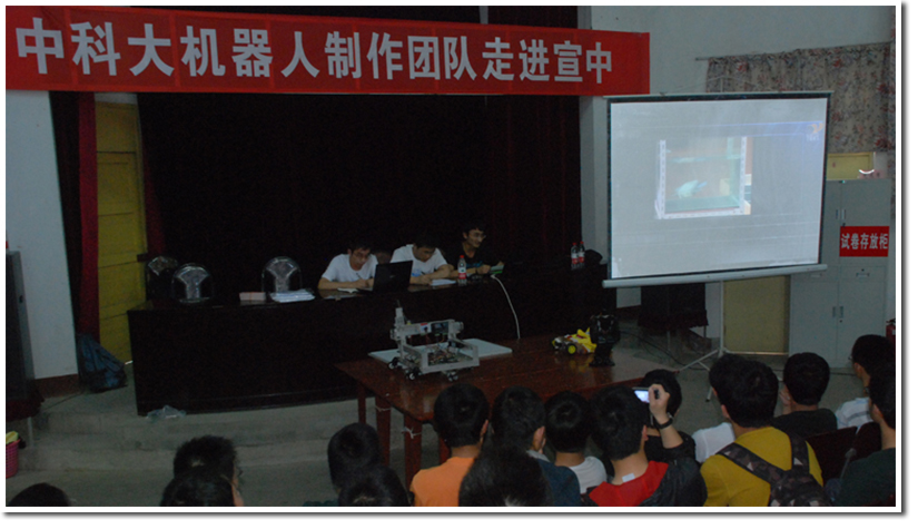 带上表演使用的机器人、电脑以及相关的维修器材,在经过了三个小时的车程,俱乐部成员顺利的抵达目的地宣城一中,受到了宣城一中校领导的热情接待。本次进中学主要通过机器人表演、ppt演示和视频来给中学生介绍相关的机器人知识,宣传机器人俱乐部和中国科大。为了避免下午的整个讲座过程出现纰漏,在经过简单的休整后,机器人俱乐部的成员开始分别准备各自的工作,欧阳可赛、朱烨、丁厚柱、范永祥、张磊同学完成对机器人的调试,并进一步熟悉下午演讲的内容。