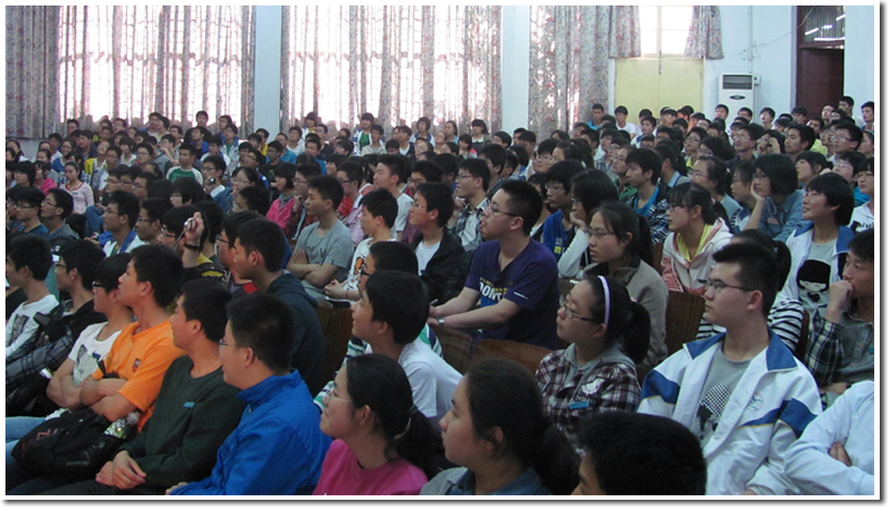 讲座开始首先播放了机器人俱乐部的robogame宣传视频。视频展示了robogame比赛中从2001年到2012年比赛的精彩内容,这些由我们学校同学自己制作出来的机器人吸引了所有参加讲座的中学生的眼球,小观众们不时惊呼,现场气氛热烈。