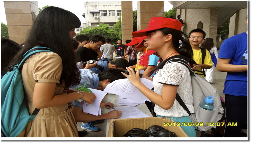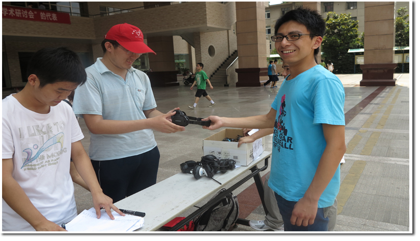 6月8日,志愿者们在东、西区的活动广场发放了耳机,受到了待考学生们的热烈欢迎,不一会儿,耳机就全部发放完了。