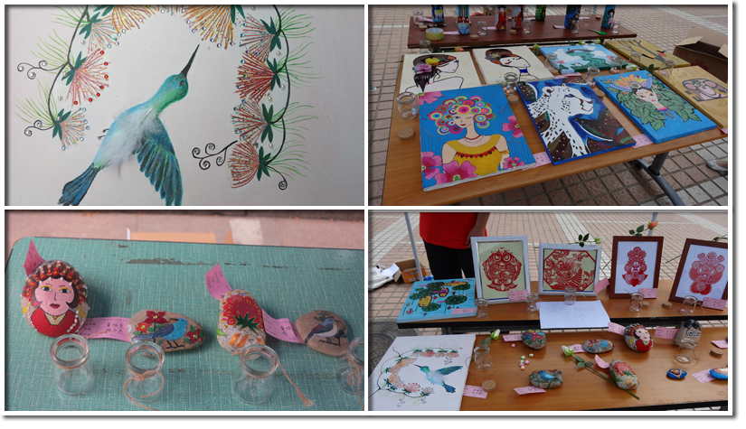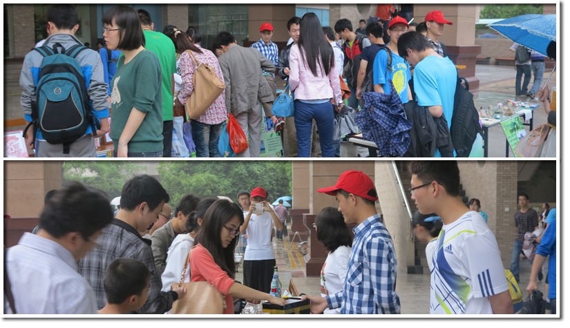 第二天下午,展览进行到一半,天空下起了小雨。西区志愿者们先是将作品转移到遮阳篷内,等待雨停,可雨越下越大,西区展览只得被迫终止。东区展览现场在十几位志愿者合作下被转移至广场内部。令我们所有志愿者十分欣慰的是前来参展的人依旧不减而且越来越多,外面再大的雨也丝毫影响不到这一片小小的天地。