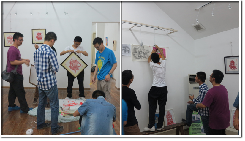 不知不觉就到六点半了,我们开始收拾作品,整理现场,然后冒着大雨将参展的作品送去艺术中心。那天晚上,只有少数作品是可以直接悬挂在墙壁上,我们七个人想了各种办法,极尽巧思,直忙到晚上十点,才终于将87幅作品全部布展成功。看到幽静的小白房中,所有的作品竞相展示,每个人都会心地笑了,内心无比开心、充实、满足,虽然每个人都又累又饿。