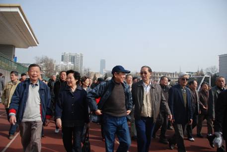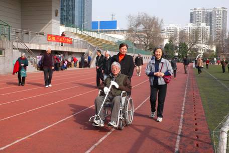 9点30分,随着发令枪响,健身走队伍在老年体育协会会旗和“中国科大离退休干部迎新春、庆三八健身走”的横幅引领下,900余名老同志列四路纵队沿跑道前行。旗手、护旗手昂首阔步、步伐矫健,舞蹈队队员光彩靓丽、飒爽英姿。健身走的人群中,既有白发苍苍年逾古稀的离休老干部,也有神采奕奕健步如飞的“年青”的退休老同志,更有坐着轮椅坚持“走”完全程、令人敬重的坚强老者。他们红光满面,精神焕发,谈笑风生,兴趣盎然,呈现出一种良好的精神面貌和心态。