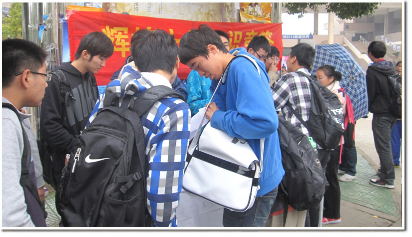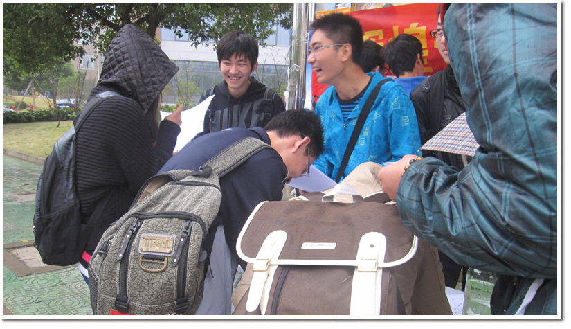 此次知识竞答以我国近年来的发展数据为切入点,提供选择题给同学们作答。题目涉及我国近年来经济、科技、环境等多个方面的内容。尽管题目颇有难度,当时天空中还飘着雨,但是同学们的积极性丝毫没有受到影响。文化长廊前的展台被热情的同学们围得水泄不通,同学们对各个题目展开了热烈的讨论。