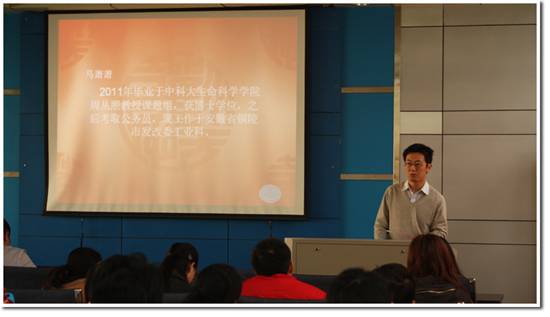 马萧萧师兄博士毕业后考取公务员,现工作于安徽省铜陵市发改委工业科。他幽默风趣的语言让现场气氛很活跃。马师兄主要讲解了他转考公务员的初衷,以及任职公务员以来的一些职场感悟,并为同学们准备公务员考试提供了一些很好的建议。