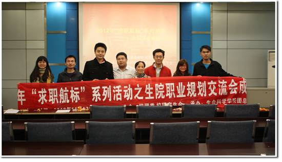 11月17日下午,2012年“求职航标”系列活动——生院职业规划交流会在生命科学学院329会议室成功举办。本次活动邀请了生命学院党总支副书记丁丽俐老师及刘丹、童小航、马萧萧三位师兄参加。