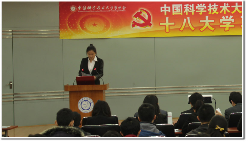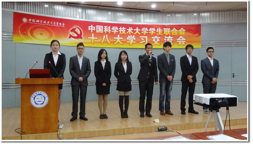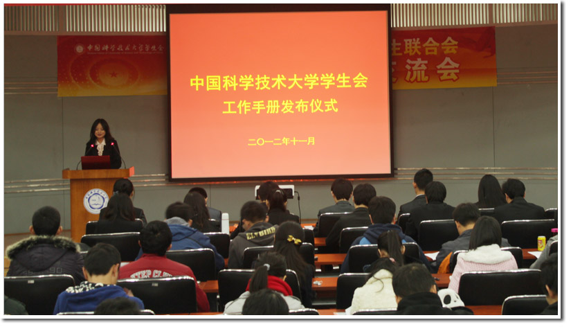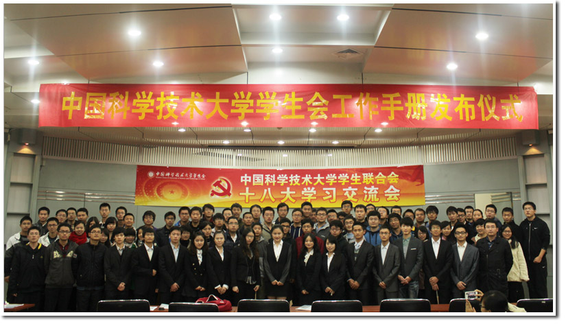 11月22日下午,中国科学技术大学学生会十八大学习交流会暨工作手册发布仪式在西区学生活动中心学术报告厅举行。出席本次交流会的有校学生会主席彭肖凌同学,副主席李想同学、杭建翔同学以及常务委员会的其他六名常委,一同出席的还有各院系学生会主席以及校学生会各部门主任及部分干事。