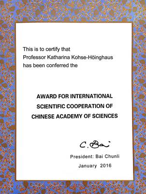 2015年度中国科学院国际科技合作奖日前揭晓,我校推荐的德国比勒菲尔德大学凯瑟琳娜?科瑟-赫英郝斯(Katharina Kohse-H?inghaus)教授成为本年度三位获此殊荣的外国专家之一,我校作为推荐单位也得到中国科学院的通报表彰。该奖项是为奖励在中国科学院院国际科技合作中做出突出贡献的高水平外籍科技与管理专家而设立,科瑟-赫英郝斯教授是该奖项自2007年设立以来首位女性获奖者,也是首位由我校推荐获奖的外国专家。