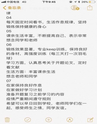 会后,三位班长对此次班会做了总结,强调同学们一定要做好自身防护,按时进行健康汇报。同时,要积极主动完成学习任务,强化自律自觉,加强体质锻炼,以更积极的姿态等待新学期的到来。
