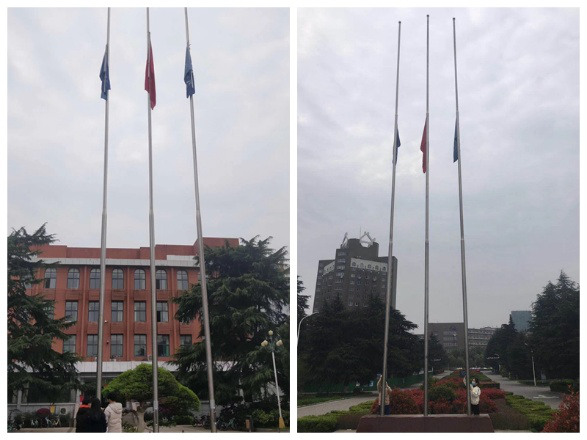 为表达对抗击新冠肺炎疫情斗争牺牲烈士和逝世同胞的深切哀悼,4月4日清晨,学校举行下半旗悼念仪式。寒假留校临时团支部团员青年迈着铿锵的步伐,在庄严肃穆的国歌声中将国旗升上旗杆顶端。下半旗仪式随即开始,国旗缓缓降至旗杆三分之一处。随后,中国科学院院旗、中国科学技术大学校旗伴随着校歌缓缓升上旗杆顶端并降至旗杆三分之一处。现场观礼人员神情凝重,无限哀思。愿逝者安息,生者奋发,祖国昌盛!