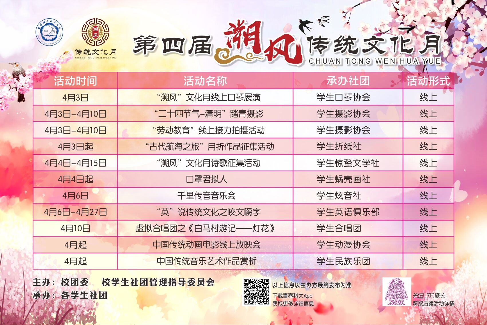 溯风传统文化月期间,学生社团还将围绕中华优秀传统文化开展中国传统音乐艺术作品赏析、清明踏青摄影、“劳育”接力拍摄、诗歌征集、传统动画放映等十一项各具社团特色的主题活动,持续发挥学生社团育人功能,充分展现青春战“疫”,“团”聚力量。