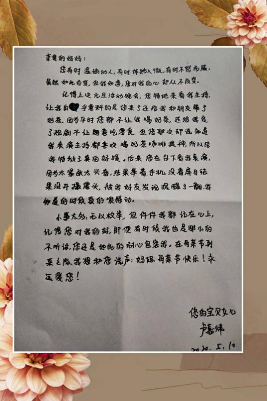 李佳桐写到:亲爱的妈妈,二十年来,我得到您的哺育,接受您的教导,终于茁壮地长大了。十分感谢二十年来您对我的养育之恩。