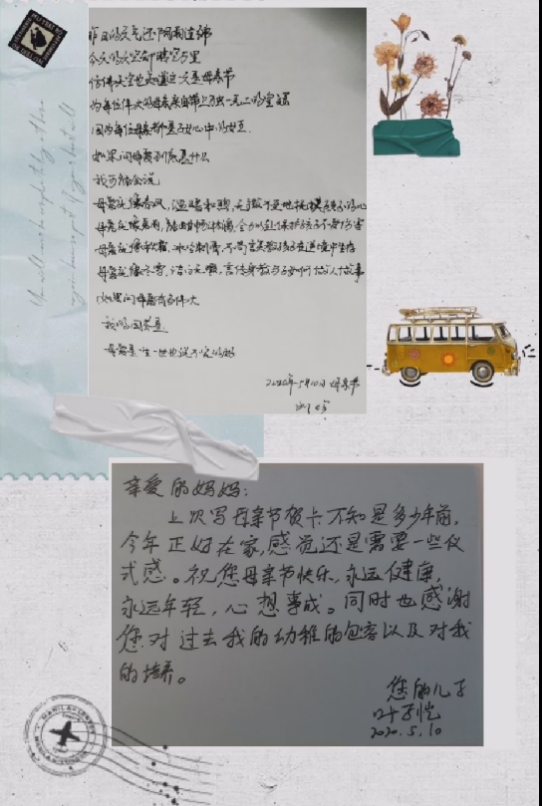 叶子恺写到:妈妈,感谢您对我过去的幼稚的包容、培养,希望这份仪式感能传达我对您的感谢。