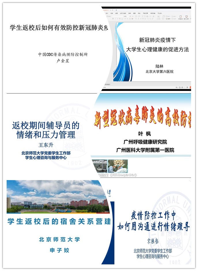 本次培训内容针对学生返校后疫情防控和心理健康而设计,涉及返校后疫情有效监测与防控、大学生心理健康促进、疫情下睡眠问题识别和应对、辅导员情绪压力管理、学生宿舍关系营建等。