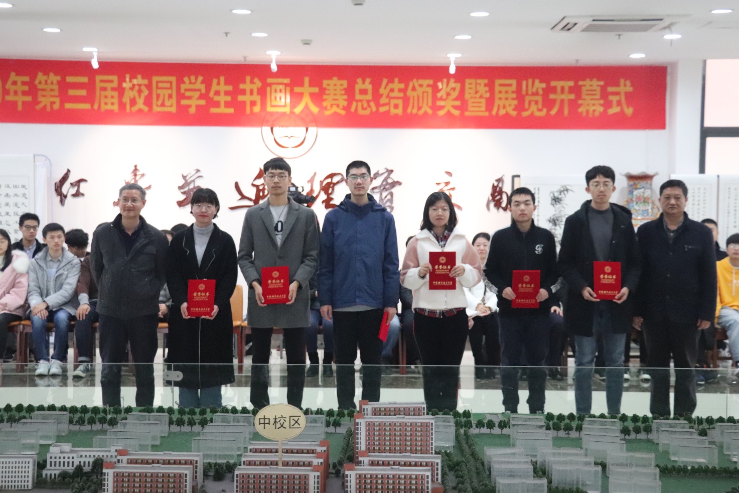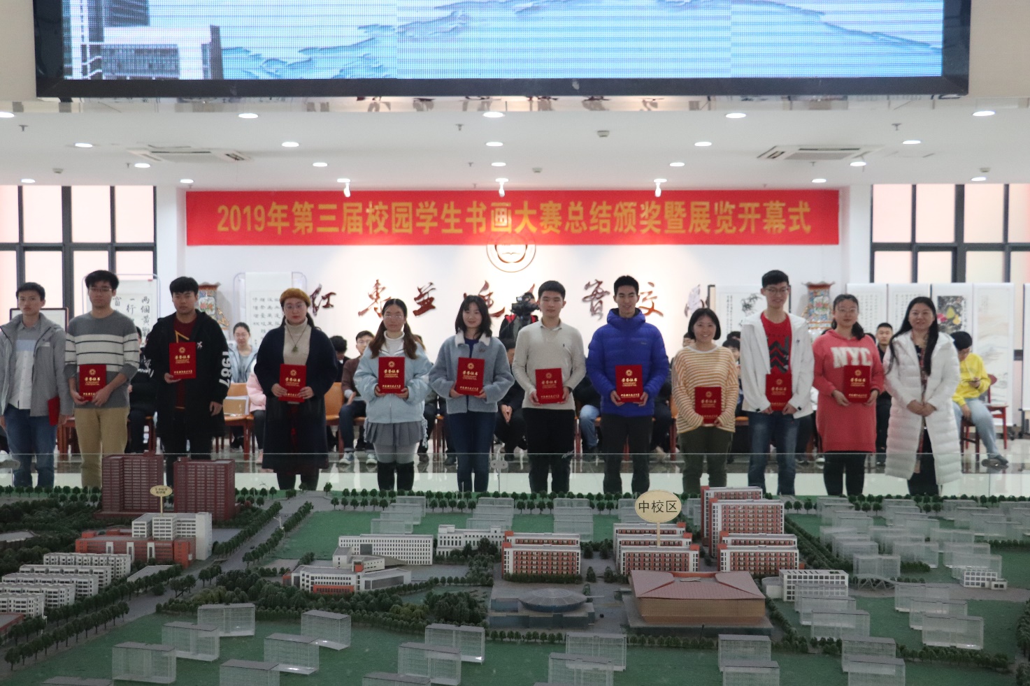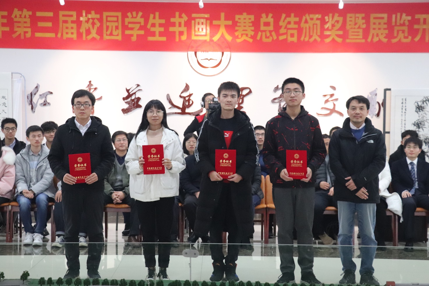 本次比赛评出一等奖4项、二等奖9项、三等奖14项,此外还设立了“优秀志愿者”“优秀社团组织者”,表彰和鼓励为书画大赛幕后辛勤奉献的社团同学和志愿者们。与会老师为获奖同学颁发了证书。