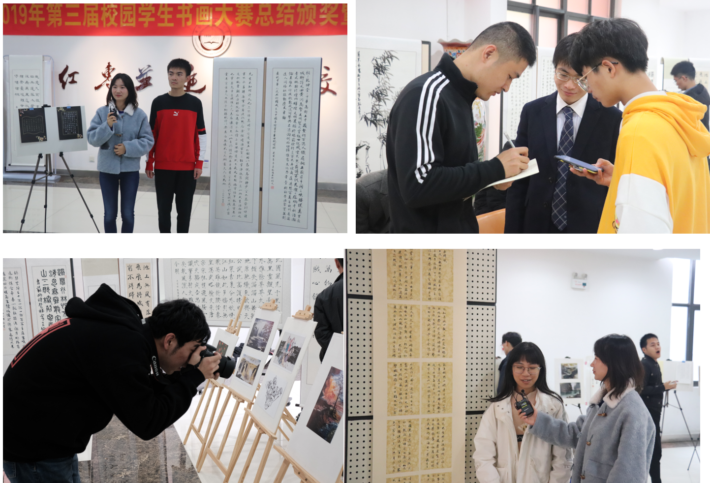校学生炫音社贾皓楠同学带来的歌曲《如约而至》作为开场,赢得了现场阵阵掌声。汪忠诚在讲话中表示,图书馆是书香之地,是文化之地,图书馆将大力支持同学们有意义的活动。社团学生代表钟德扬、周小优、万新燕、叶子恺分别发言,他们表示,同学们在课余之时,不忘潜心研究书画艺术,通过书画搭建友谊之桥,不仅锻炼了个人的兴趣爱好,还结识了许多志同道合的朋友,乐在其中。