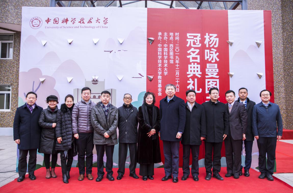 12月26日,中国科学技术大学“杨咏曼图书馆”冠名典礼在西区举行。香港合孚行有限公司董事总经理邓杨咏曼、邓秉钧医生伉俪,中央人民政府驻香港特别行政区联络办公室协调部部长朱文,安徽省委统战部副部长、省侨办主任万以学,中国科学技术大学党委书记舒歌群,党委副书记蒋一,党委常委、统战部部长褚家如,以及上海交通大学、中欧国际工商学院等单位代表出席了仪式。仪式由校党委常委、校长助理、秘书长傅尧主持。
