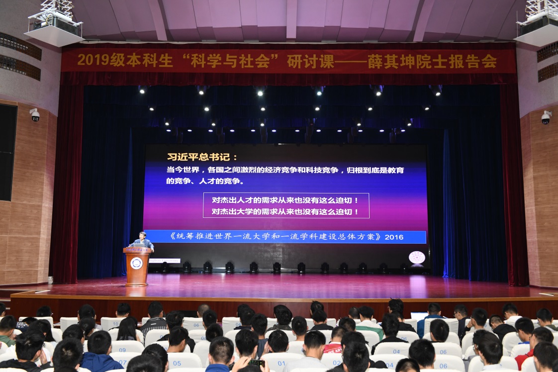11月11日晚,清华大学副校长薛其坤院士应邀为2019级本科生带来《胸怀祖国,放眼世界,做一个新时代科技创新的奋进者》主题报告。这是我校2019级本科生“科学与社会”研讨课第二场主题报告,报告会由教务处常务副处长曾长淦教授主持,2019级全体本科生到场聆听。