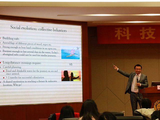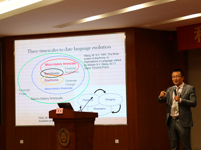 11月27日晚,应人文与社会科学学院邀请,广东外语外贸大学云山讲座教授龚涛作客“科技人文讲堂”,在东区活动中心五楼报告厅给科大师生们带来了关于演化语言学的报告,题为《演化语言学跨学科研究:理论,实例与预测(Interdisciplinary Evolutionary Linguistics Research: Theories, Examples and Predictions)》。本次报告会由人文与社会科学学院党委书记褚建勋老师主持。