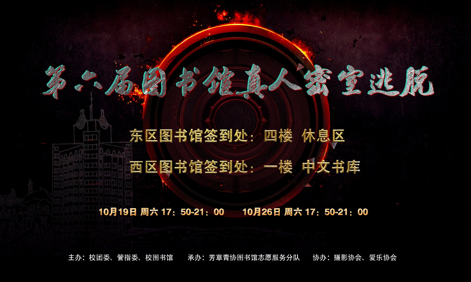 为加强同学们对图书馆藏书分布和索书号编码规律的了解,丰富同学们的课余生活,展现图书馆丰富多彩的一面,在校团委、管指委、图书馆的大力支持下,图书馆志愿服务分队李佳桐、叶子恺、骆成章、程凯歌共同策划,联合校学生摄影协会和爱乐乐团于10月19日和26日晚分别在东区图书馆的三、四层阅览书库和西区馆中文书库举办第六届探秘图书馆真人密室逃脱活动。