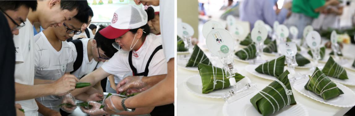 活动现场在包粽子区域组织了六个教学点,同学们跟随食堂师傅一丝不苟地学习包粽子,虽然很多同学是第一次尝试,但包出来的粽子都有模有样,食堂师傅们赞不绝口。