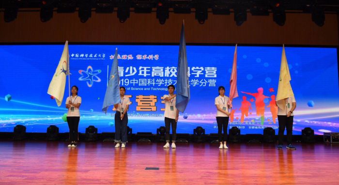 随后,来自江苏省盐城中学的教师王卉代表全体带队老师发言,上海交通大学附属中学的王怡人代表全体营员发言。安徽省教育厅基础教育处副处长张连富为中国科大分营授营旗,中国科大教务处处长助理吴强接营旗,并分别为红、黄、蓝、绿四个队授队旗。