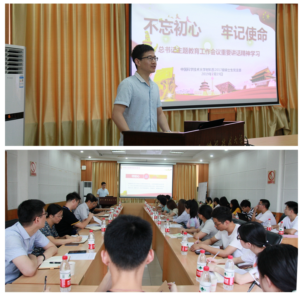 7月19日上午,化学与材料科学学院材料科学与工程系2017级硕士党支部在材料楼5楼会议室召开支部党员大会,学习“不忘初心、牢记使命”主题教育工作会议精神。校党委书记舒歌群作为对口联系学生党支部的校领导参加会议,并对学生支部党建工作给予指导。校党委组织部常务副部长邓建松、化学与材料科学学院党委书记闫立峰、材料科学与工程系总支书记刘伟丰及党支部全体成员参加会议。会议由党支部书记杜进祥主持。
