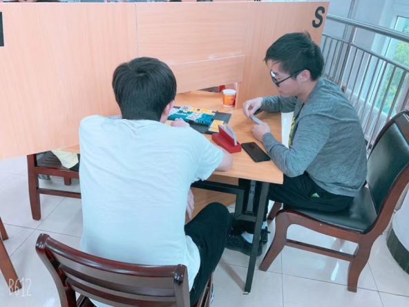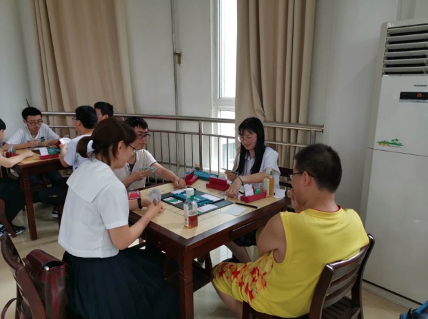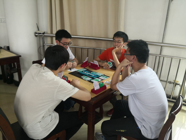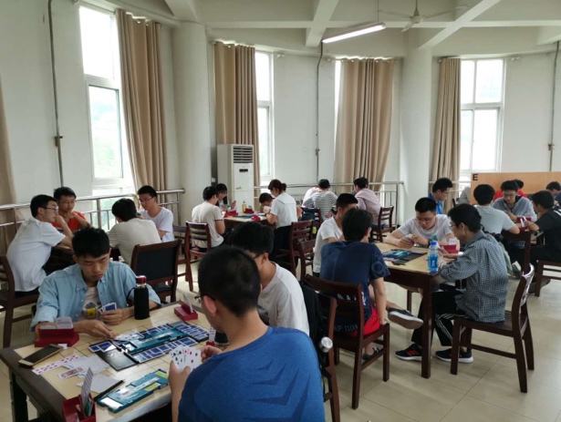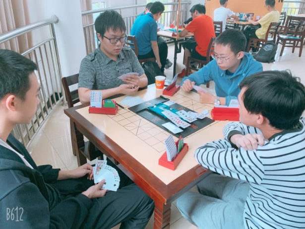 比赛进行得相当顺利。有几桌同学打得很快,打完后利用空余时间进行讨论和交流;还有几桌的比赛相当焦灼,参赛选手之间斗智斗勇,仔细计算着每一张牌。虽然速度有快有慢,水平有高有低,但比赛氛围十分和谐,参赛选手之间的交流非常友好,“胜不骄,败不馁”,彼此之间相互借鉴、学习。