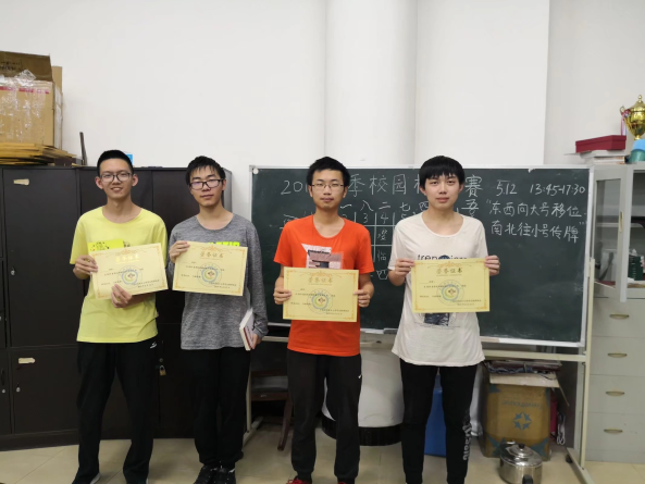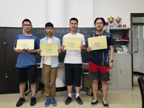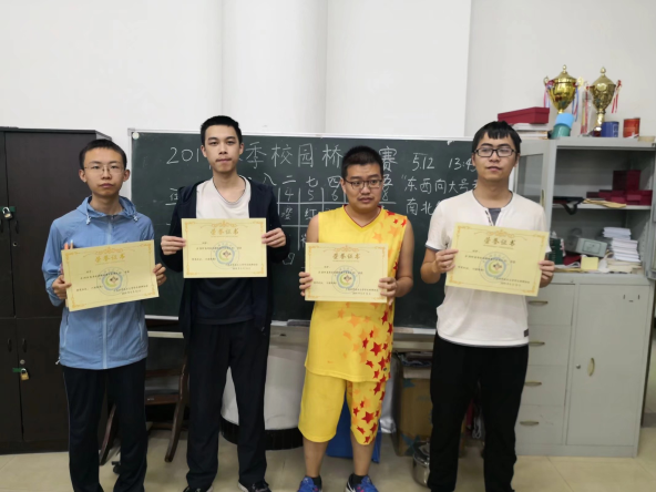 下午5:20,分数录入完毕。最终,“X-5”队的贺晟和张峰瑞获得南北组冠军,“嘤嘤嘤”队的朱子璇和赵良镛获得南北组亚军,“锤爆他”队的曾建伟和庞欣炜获得南北组季军;“多义”队的徐诚超和刘静远获得东西组冠军,“音痴”队的管士奥和黄世贤获得东西组亚军,“慈善”队的符深和李根获得东西组季军。前三名的同学们获得了奖状和桥牌书作为奖品,参赛队员和旁观同学们每人获得了一本软面抄作为比赛纪念品。