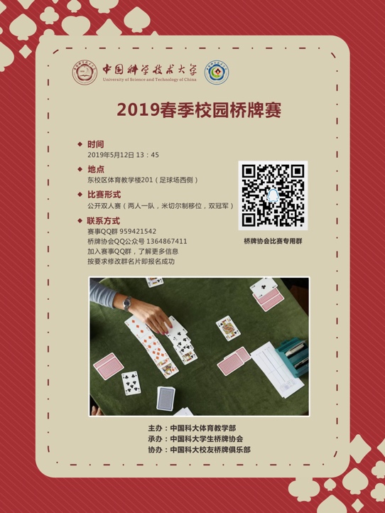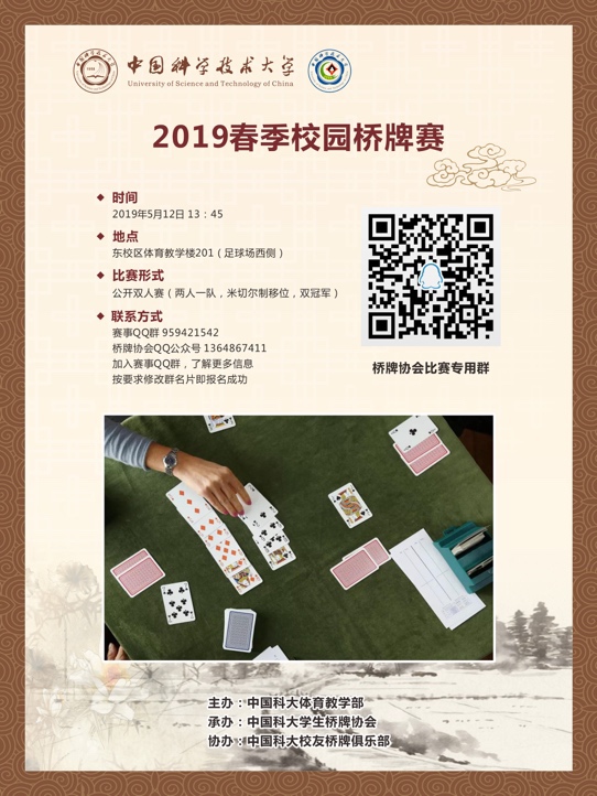 5月12日下午,中国科大2019年春季校园桥牌赛在体育教学楼201教室按照计划顺利落幕。本次桥牌赛由体育教学部主办、校学生桥牌协会承办、科大校友桥牌俱乐部协办,全校近40名同学参加比赛,许多同学前来现场观战。最终,贺晟同学和张峰瑞同学获得南北方向冠军,徐诚超同学和刘静远同学获得东西方向冠军。