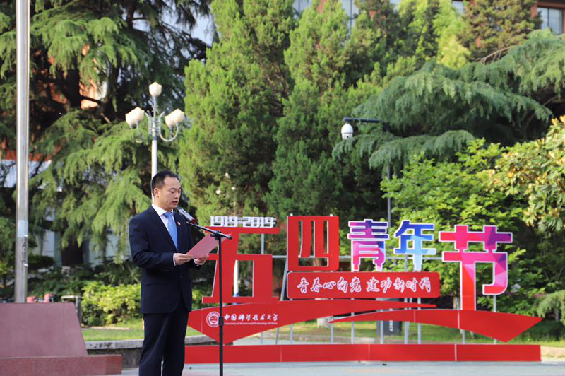 校国旗护卫队舒严同学带领大家重温入团誓词,发表青春宣言,缅怀历史,砥砺前行。重温誓词提升了现场青年作为共青团员的使命感,同学们备受鼓舞。在国旗下,2017级物理学院吴司同学作为优秀团员代表发言,号召同学们高举团旗跟党走,响应时代召唤,自觉传承五四精神,让蓬勃青春与家国情怀共振。