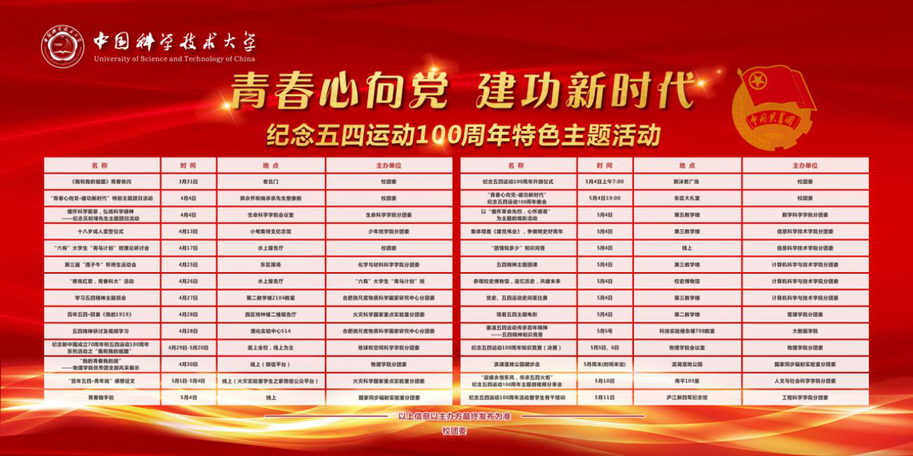 五四期间,各级团学组织开展了丰富多彩纪念活动,注重发挥实践育人、文化怡情养志的重要作用,如少年班学院分团委组织开展十八岁成人宣誓仪式,物理学院举办纪念五四运动100周年知识竞赛。学校还通过悬挂青年寄语横幅、摆放五四纪念标识以及在校内公共电子屏播放青年风貌视频的方式,进一步营造五四青年节氛围,激励广大团员青年牢记青春使命、矢志奋斗报国。