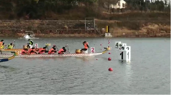3月7日下午,100米直道速划比赛开始。第一轮比赛,随着裁判长一声“划”令下,队员们跟着鼓手的节拍奋力向前划去,最终取得了26秒75的成绩,位列六支队伍的第一。队员们上了岸趁休息间隙仔细分析比赛过程中的问题:划的过程中存在着左右桨不齐,后面桨跟不上节奏等问题。