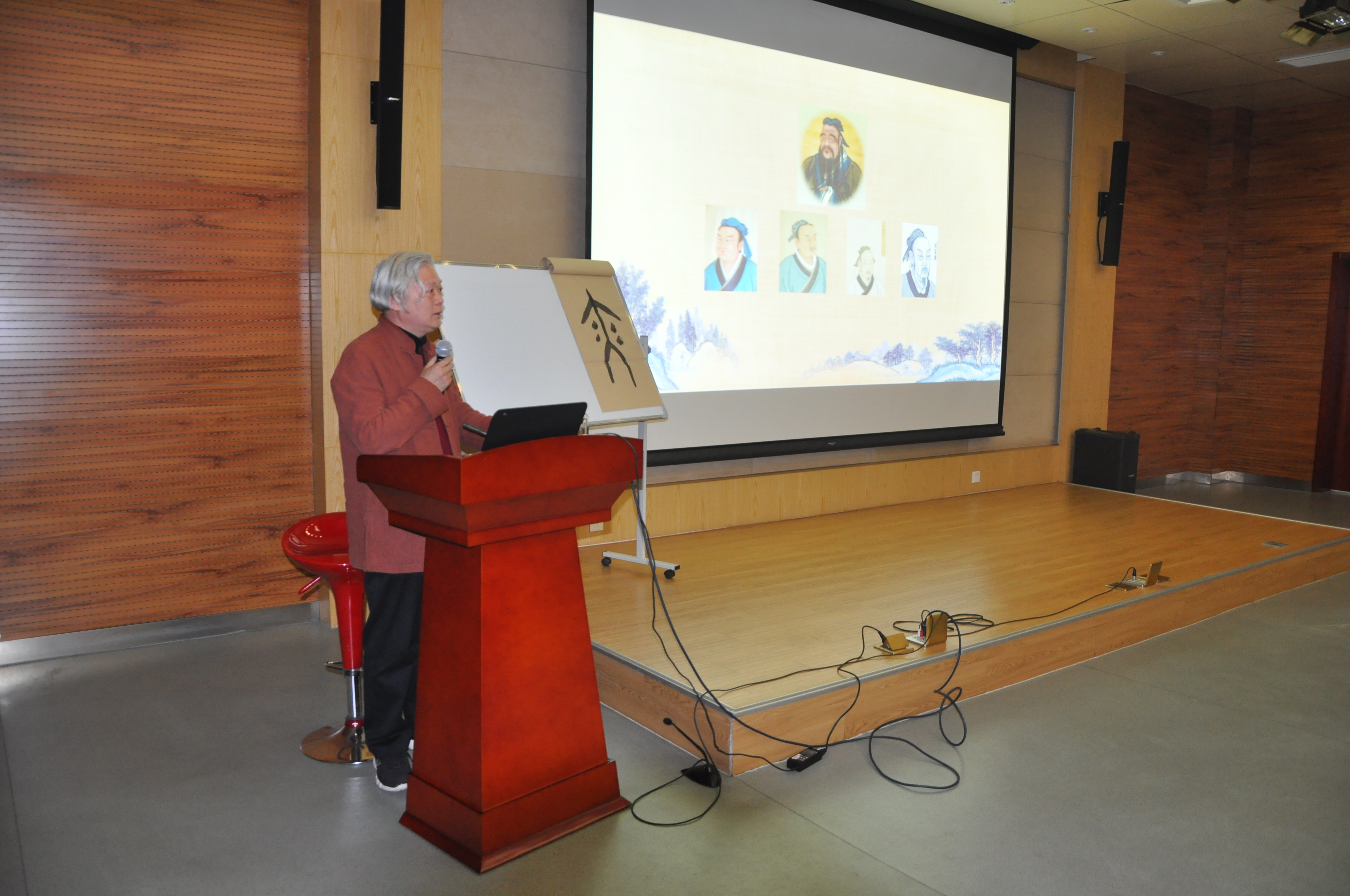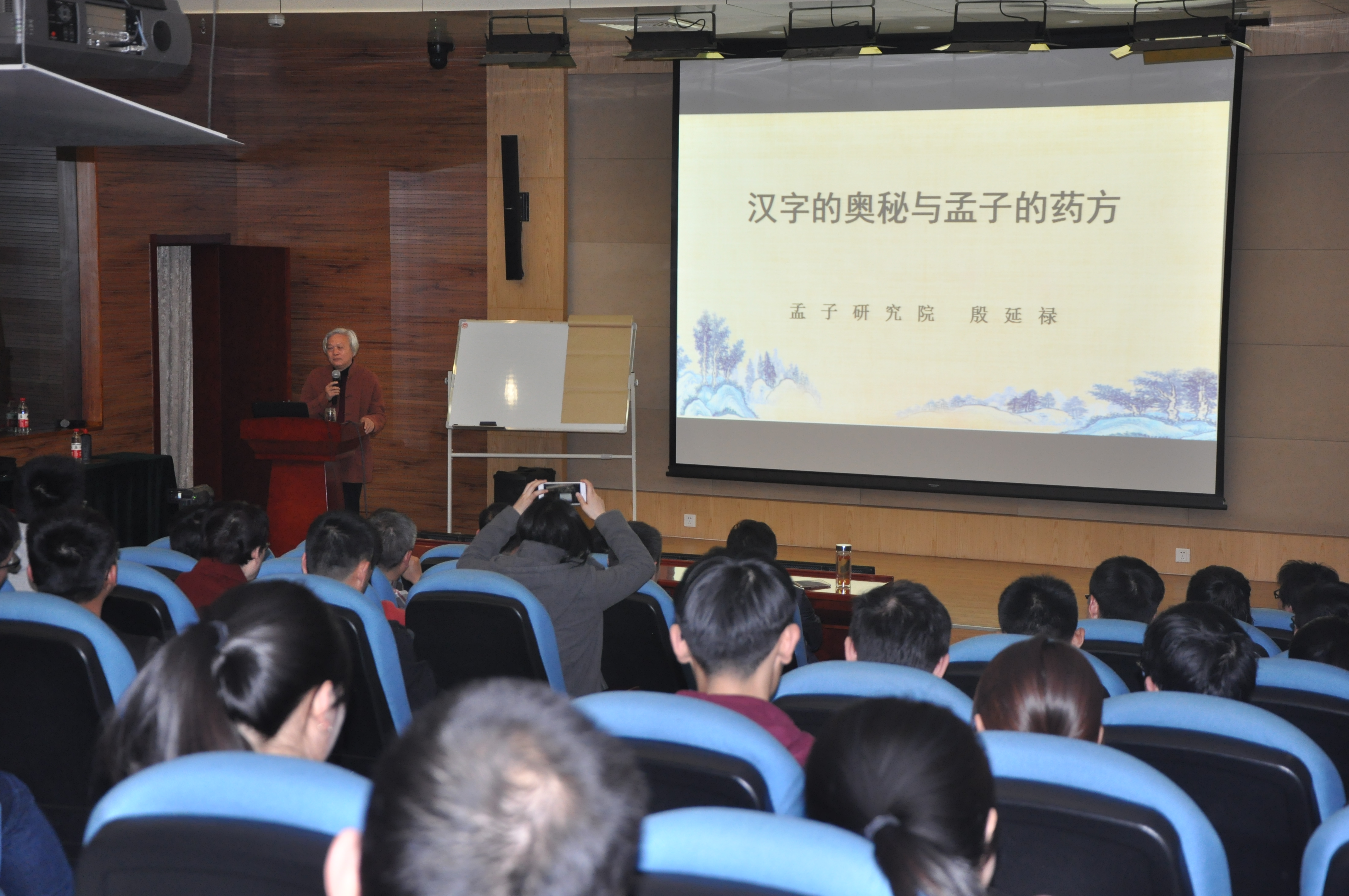 活动邀请了孟子故里——山东邹城孟子书院执行院长殷延禄作题为“汉字的奥秘和孟子的药方”的报告。报告将博大精深的儒家学说、孟子思想,与汉字的文化之美、现场的书法展示完美地融合在一起。梁启超先生曾评价:“《论语》如饭,最宜滋养;《孟子》如药,最宜袚除及兴奋”。孟子开出了两幅药方:一个是内服的药方,叫不忍人之心;一个是外敷的药方,叫不忍人之政。殷延禄在报告中通过对“人、仁、端、修、性、老、孝、义、取、礼、路、席、智、识”等汉字字源的梳理,以说文解字的方式,深入浅出、生动形象地讲述了“不忍人之心”这幅内服药方的内涵和当代价值。
