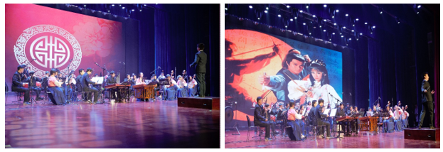 中华传统文化是中华儿女共同的精神基因,是中华民族的根和魂。学生民族乐团演奏的民族管弦乐《庆典序曲》及《射雕英雄传》将晚会引入新的高潮。在热烈激昂的管弦乐声中,师生们的民族自豪感油然而生豪情满怀。