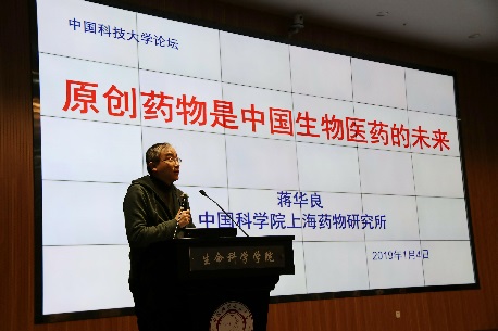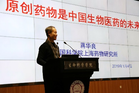 1月4日上午十点,中国科学院院士蒋华良做客“中国科大论坛”,在生命科学学院一楼报告厅做了题为《原创新药是中国生物医药的未来》的学术报告。报告会前,包信和校长会见了蒋华良院士,临床医学院执行院长翁建平教授与蒋华良院士进行了深入会谈。会议开始,生命科学与医学部执行部长、生命科学学院执行院长薛天教授代表学校向蒋华良院士颁发了中国科大论坛纪念牌。