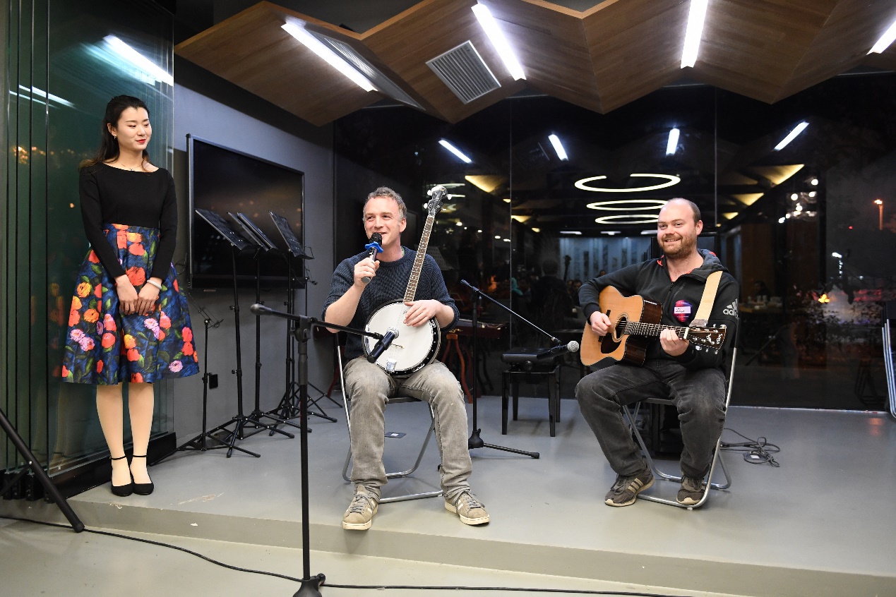 来自爱尔兰的外籍教师奥格和他的爱尔兰朋友用班卓琴和吉他演奏爱尔兰民谣,欢快明朗的节奏将音乐会的气氛推向了高潮。