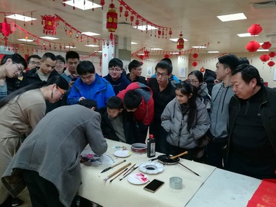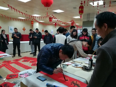 写春联、贴福字是集文学和书法于一体的中国特有的文化形式,是中华民族辞旧迎新的传统习俗。联欢会上,学工部岳兴林老师为在场师生泼墨写新春、挥毫送祝福,并指导同学们自己动手写春联,表达新年美好的愿望。