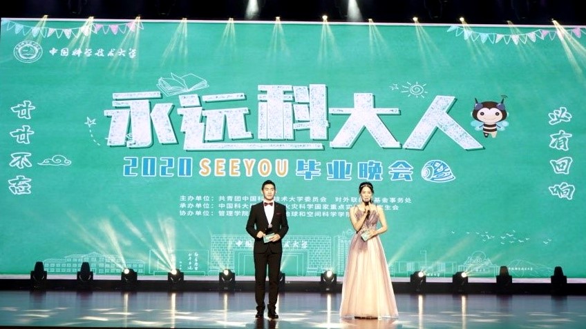 6月20日晚,中国科学技术大学“永远科大人”毕业纪念系列活动之See You 2020毕业纪念晚会精彩呈现。晚会由校团委、对外联络与基金事务处主办,校研究生会、火灾科学国家重点实验室研究生会承办,部分节目在东区大礼堂演出,部分节目通过线上合成,整体通过网络播出。校领导和全校各单位师生,尤其毕业生纷纷相聚云端,共同观看演出,晚会也受到广大校友和社会的关注,直播平台峰值突破5.3万人。